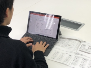次に、実際にPowerPointのスライド上で、課題がどのように構成されているのか、またどのようなマトリックスなのかを読み解き、作り方を学んでいきました。解説を受けた後、自分たちで実践していきました。ここでも同様にタイムをはかり、「より早く終わらせる」ということを頭に置きながら実践していきました。