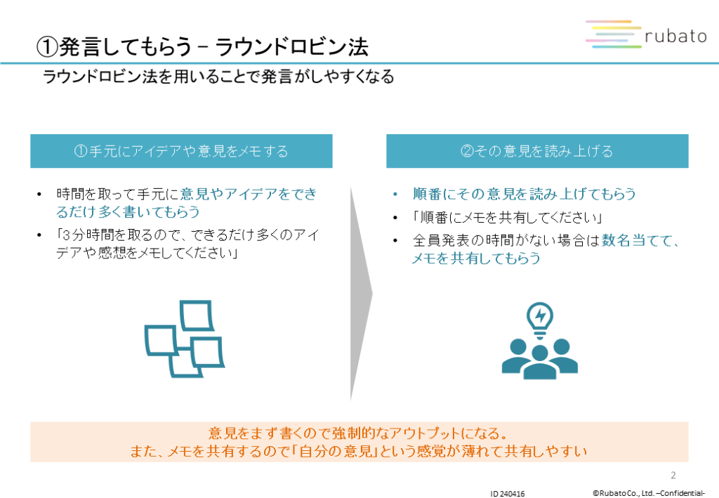 二つ目は「ラウンドロビン法」です。これは会議の最中にテーマや論点について、時間をとって、参加者一人一人が自分の意見やアイデアを手元にメモを書き、そのメモを順番に読み上げてもらう手法です。時間を取ってメモを書くので強制的なアウトプットになること、そしてメモを読み上げて共有するので「自分の意見」という感覚が薄れるという効果があります。時間が限られている時は全員にメモを共有してもらわず、一部の参加者の共有でも構いません。