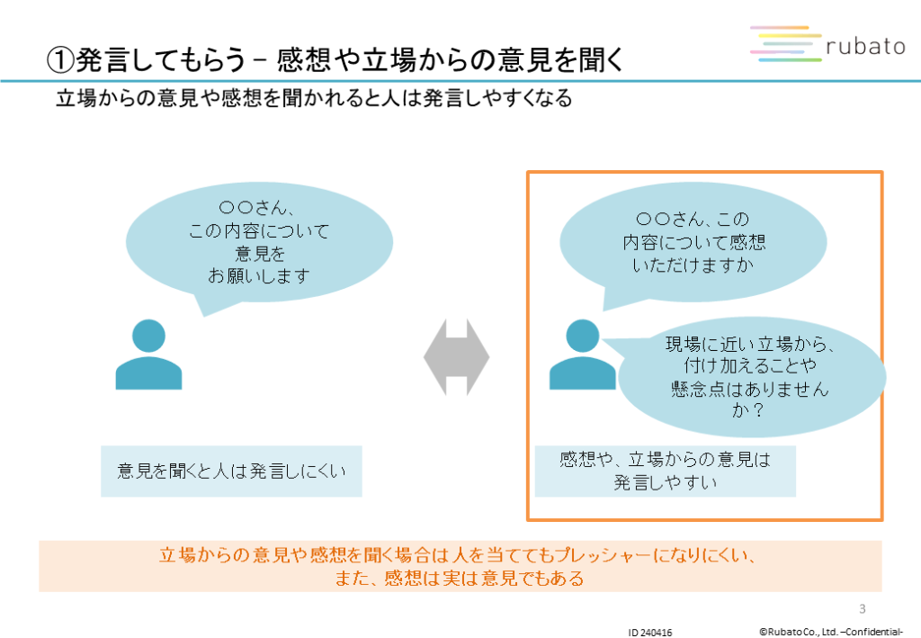 三つ目は「感想」や「立場からの意見」を発言してもらうという方法です。「意見を聞かせてください」と伝えると人は発言に抵抗感を感じることが多いですが、「感想を聞かせてください」と言われるとある意味気楽に発言できます。また、「現場に近い立場から、付け加えることはありませんか?」などと伝えると「個人」より「立場」がフォーカスされるため、発言しやすい傾向があります。特定の人の発言が必要な時はこのような方法で発言を促すことが有効です。
