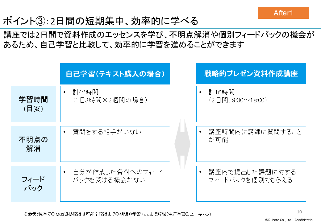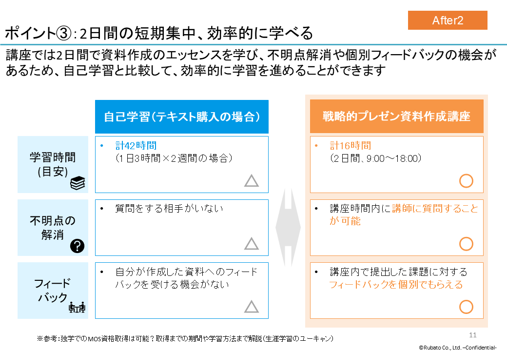この例では「自己学習と比べて、資料作成講座を受講する方が効率的に学習を進められる」という点を伝えたいので、対比型の図解を用います。