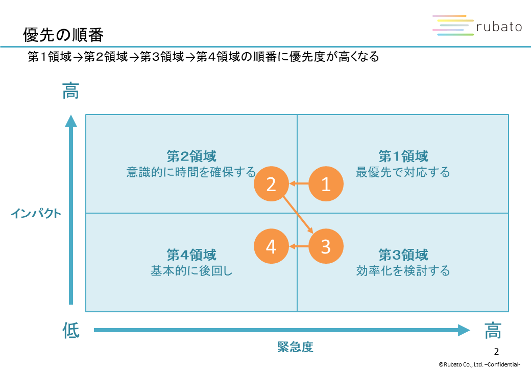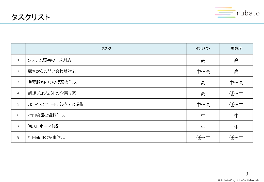 実際の業務ではタスクリストを作って、インパクトと緊急度を3段階くらいで判断すると良いでしょう。