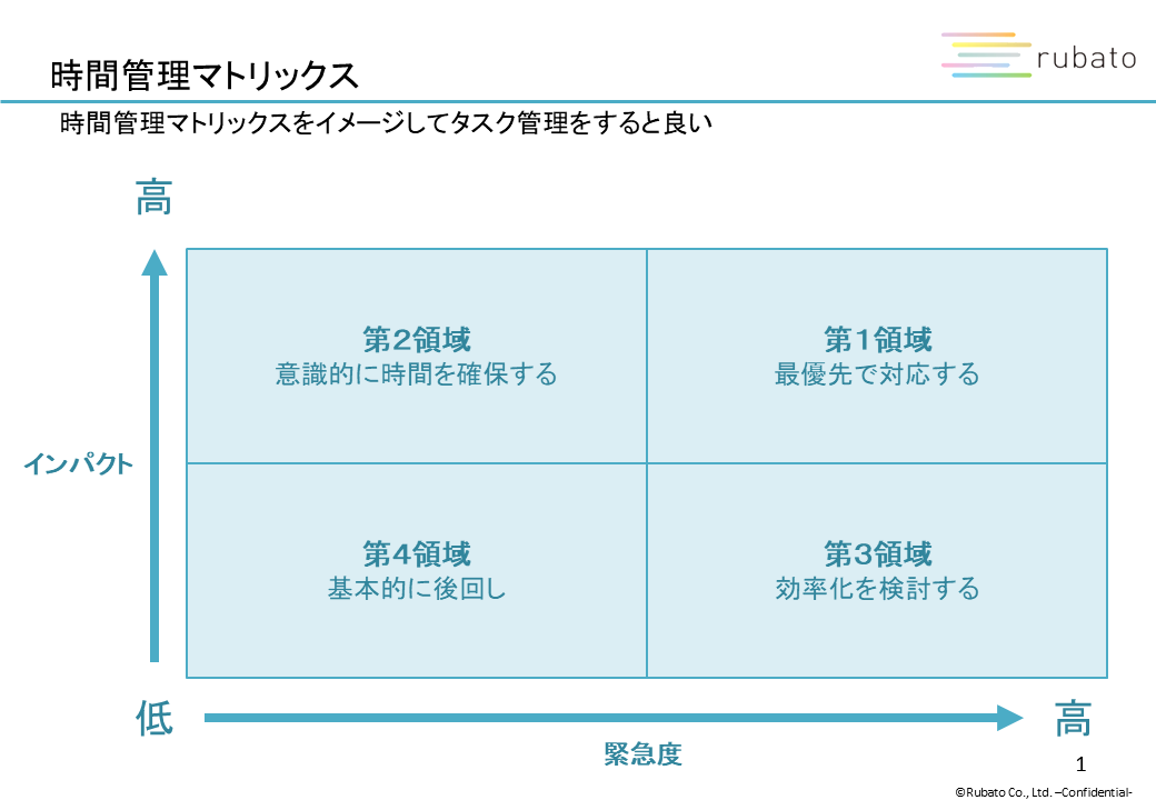 例えば、顧客への提案書の作成は、自分のアウトプットが遅れると上司レビューが遅れ、最終的に提案品質の低下になってしまう可能性があります。自身のタスクが誰のタスクにつながり、最終的にどんな成果物になるのかという全体像を頭に描いた上でインパクトや緊急度を考えることが大変重要になります。