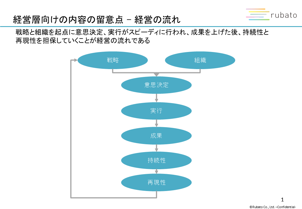経営の流れとは、戦略と組織を起点に意思決定を行い、施策を実行し、成果を上げ、そしてその施策の持続性と再現性を担保していくことになります。