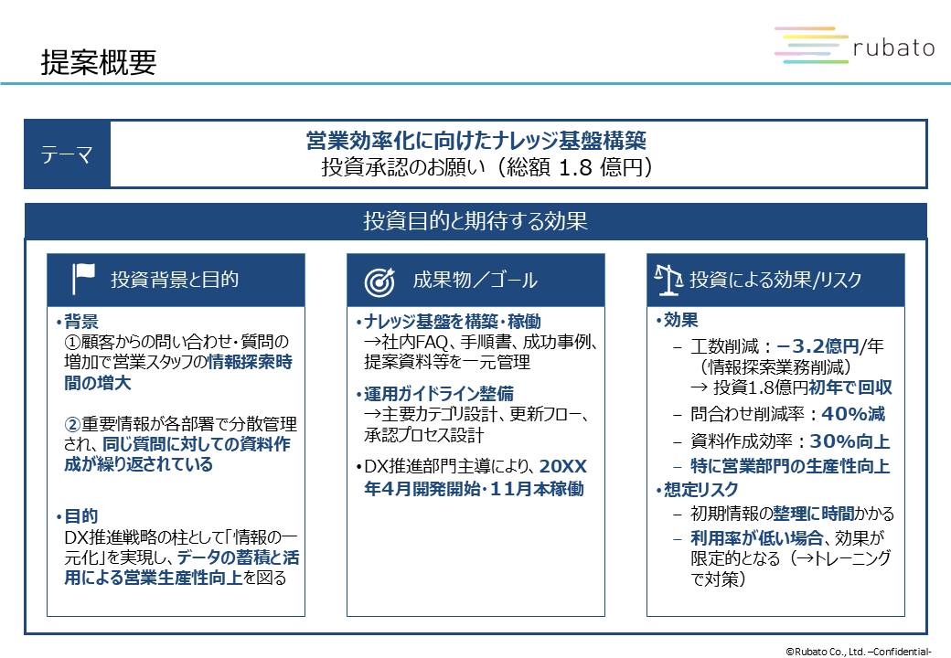 成果が曖昧な案には、経営層は動きません。期待成果、投資対効果(ROI)、データや根拠、リスクと対応策など、数字と根拠があるかが重要です。