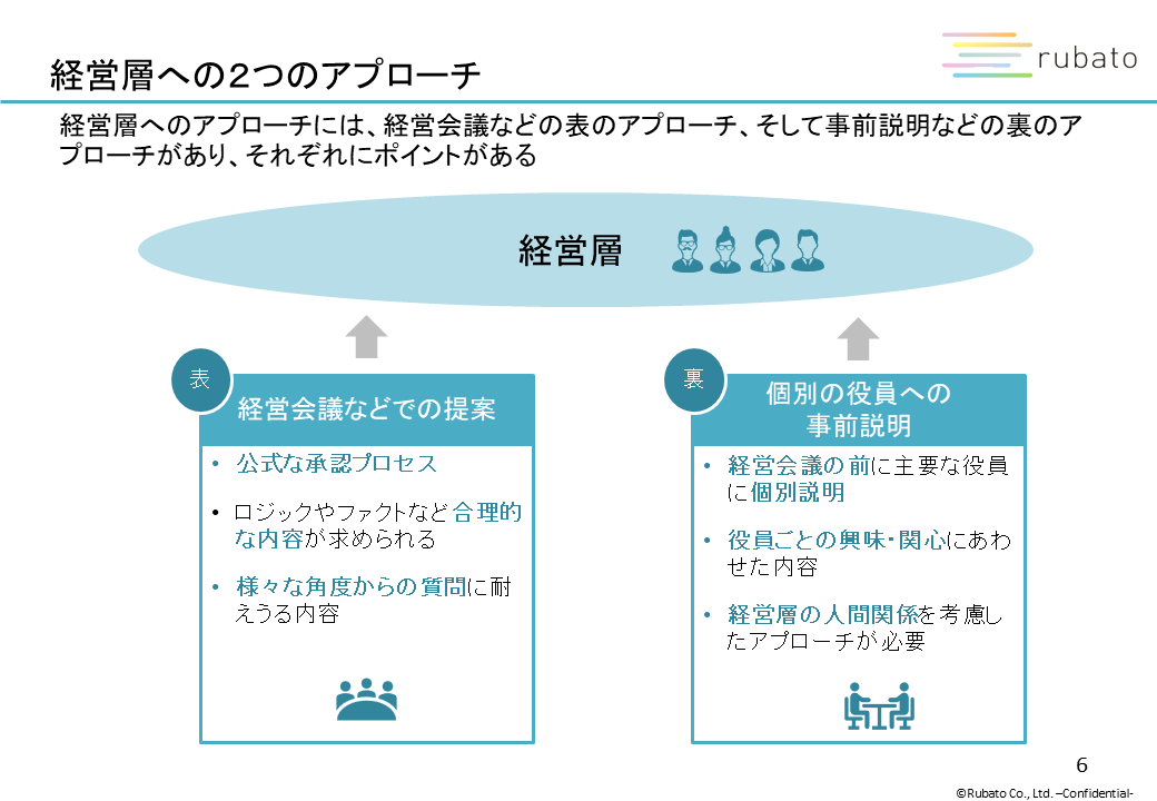 もう一つは、経営会議にかける前に主要な経営陣へ個別に説明する「裏のルート」です。