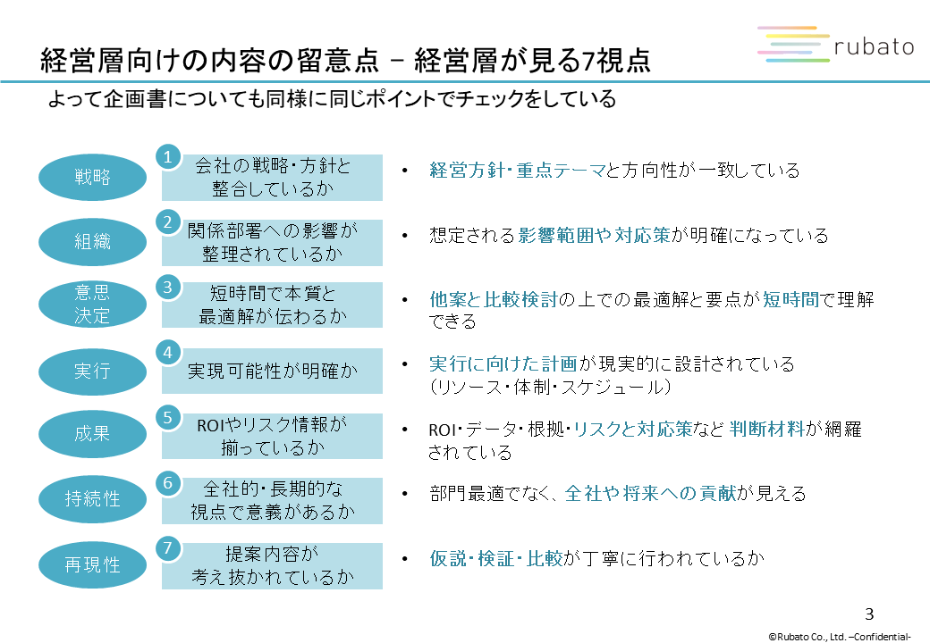 このような企画書が陥りがちな3つのポイントを押さえた上で、経営層に刺さる企画書のポイントを見ていきたいのですが、その前提として、まず押さえておきたいのが、経営層が経営の意思決定する際に重視している「7つのポイント」です。