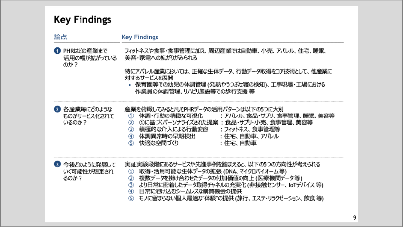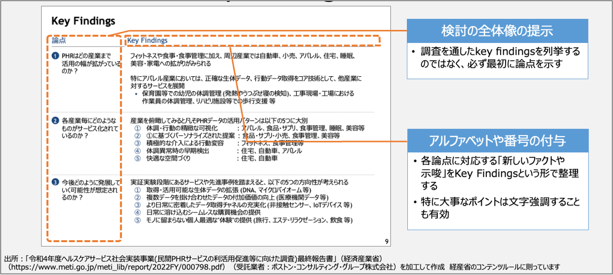 - 事実と示唆が混在した資料を見ることが多いですが、BCGのこの資料のようにKey Findingsと示唆は分けることが重要です