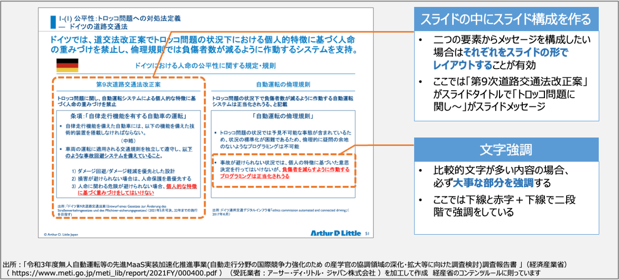 - スライドは左から右の順番に読まれるので、概要を理解して具体的な内容を読むという理解しやすい流れを作ることができます