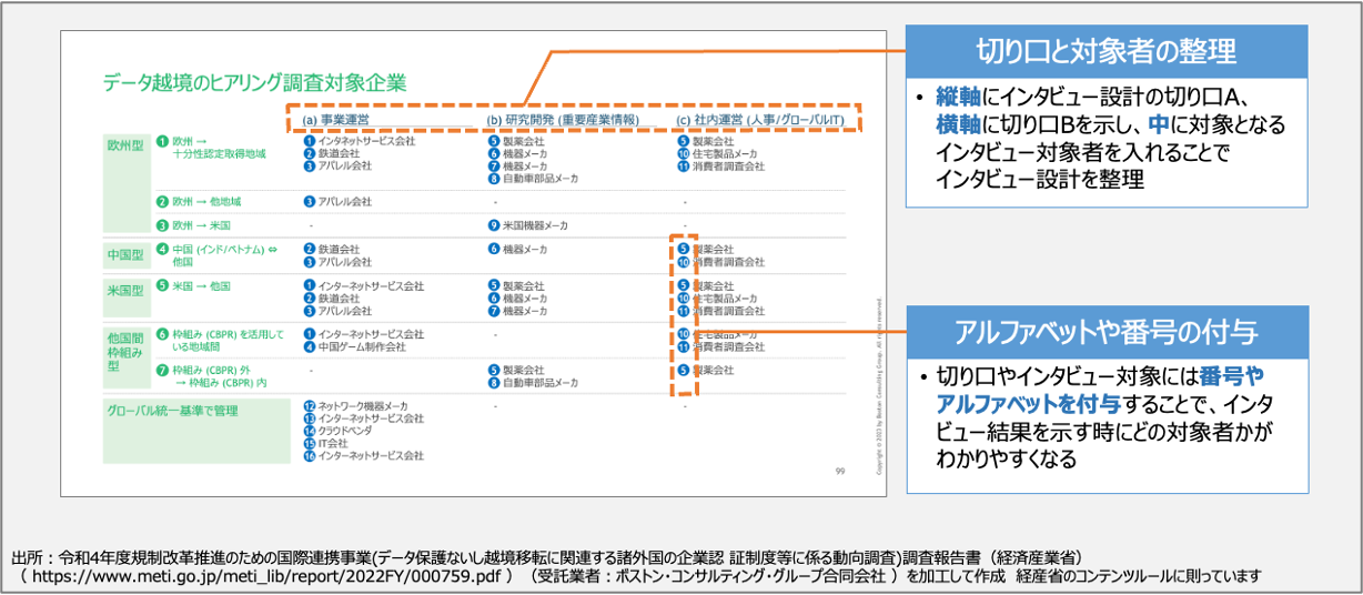 - インタビュー設計のスライドでは、目的と整合する対象者の切り口を示すことが有効です