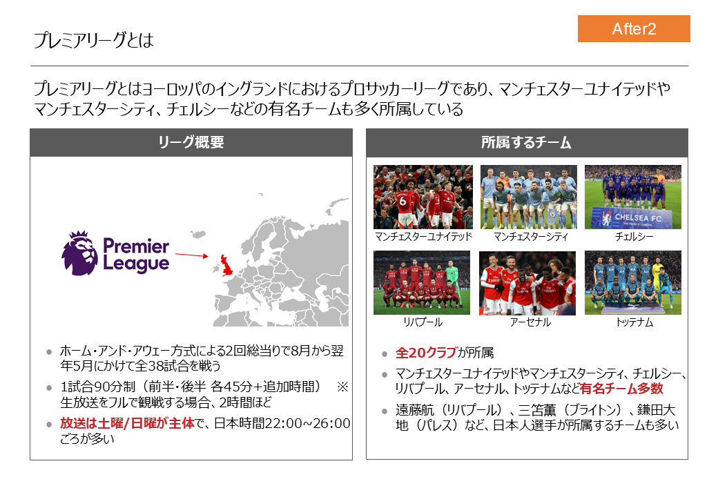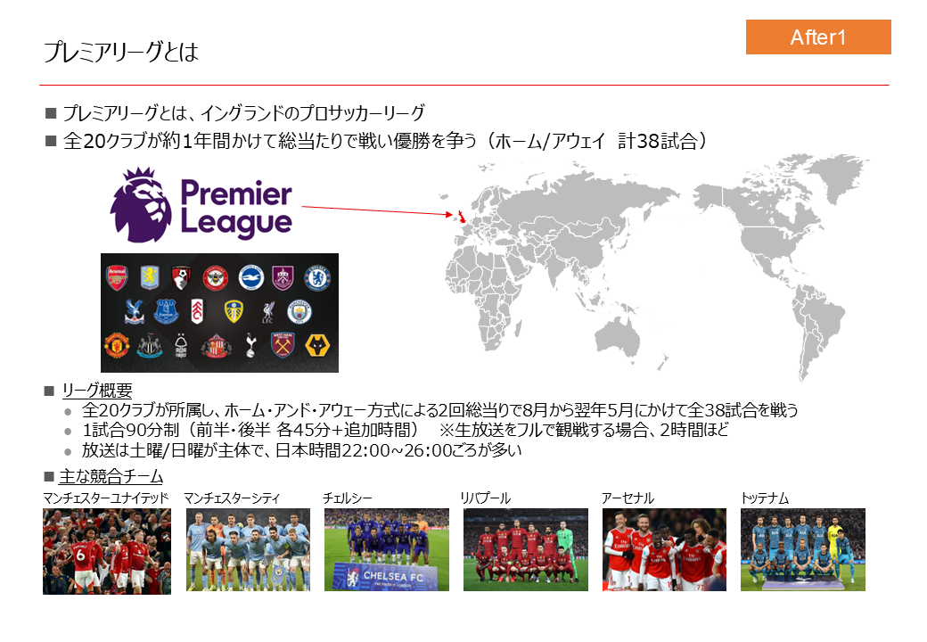 今回はイングランドのプロサッカーリーグ「プレミアリーグ」を説明するスライドを添削してみます。
