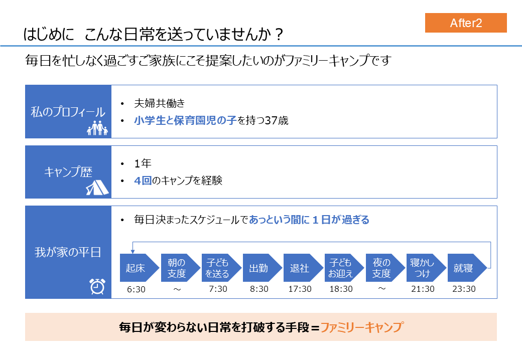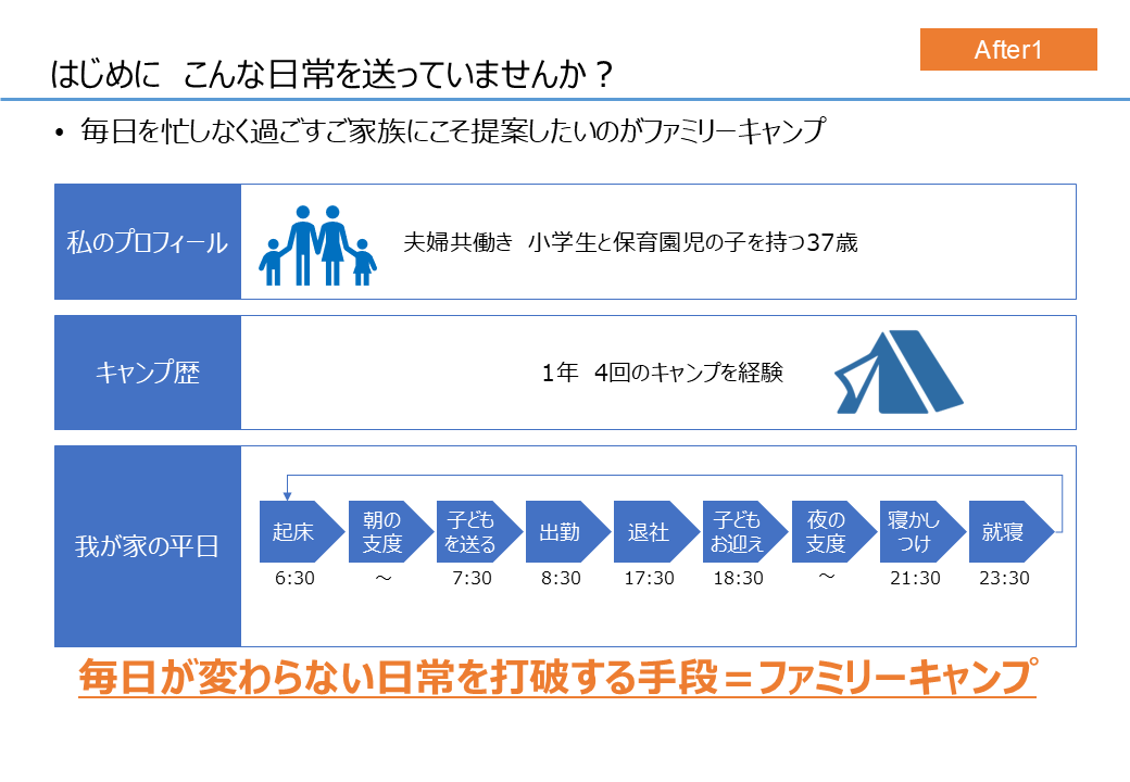 今回は、「小見出し」をメインテーマに、「ファミリーキャンプ」をお薦めするスライドを添削してみます。
